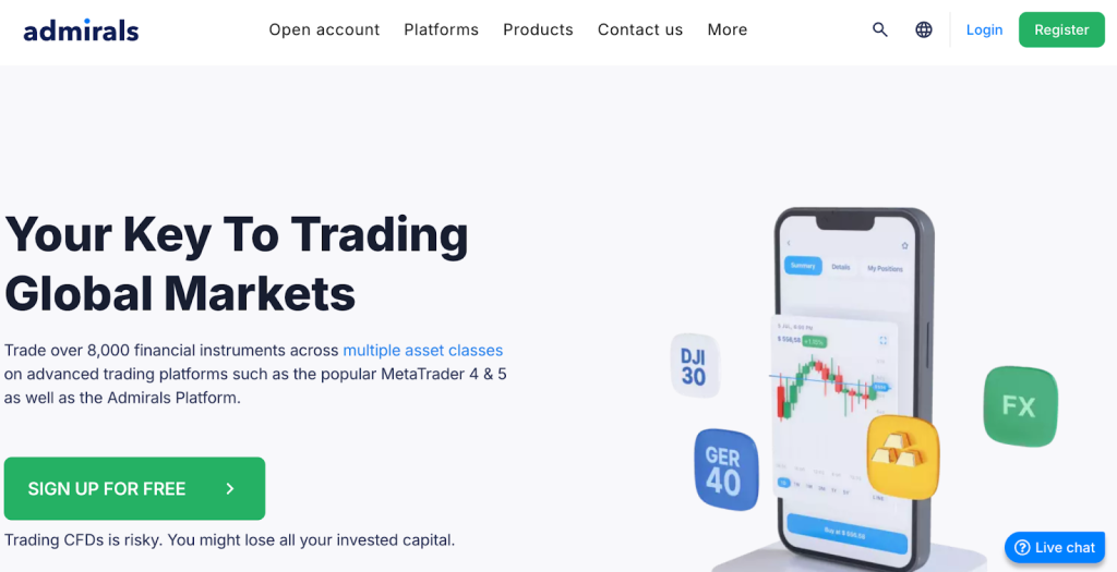 Alt text: Admirals homepage displaying European FCA-regulated broker with Admirals Academy, 30+ crypto CFDs, MT4/MT5 platforms and Supreme Edition plugin for advanced MetaTrader trading.