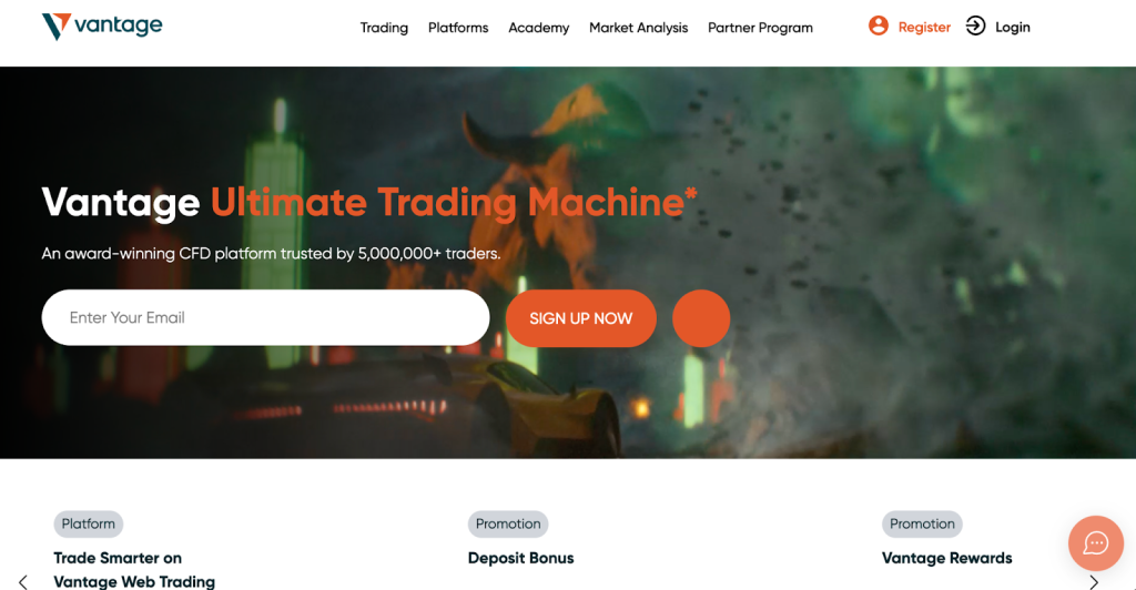 Alt text: Vantage homepage featuring ASIC-regulated Australian broker with RAW ECN accounts, ProTrader tools, TradingView integration and 15+ crypto CFDs on MT4/MT5 platforms.