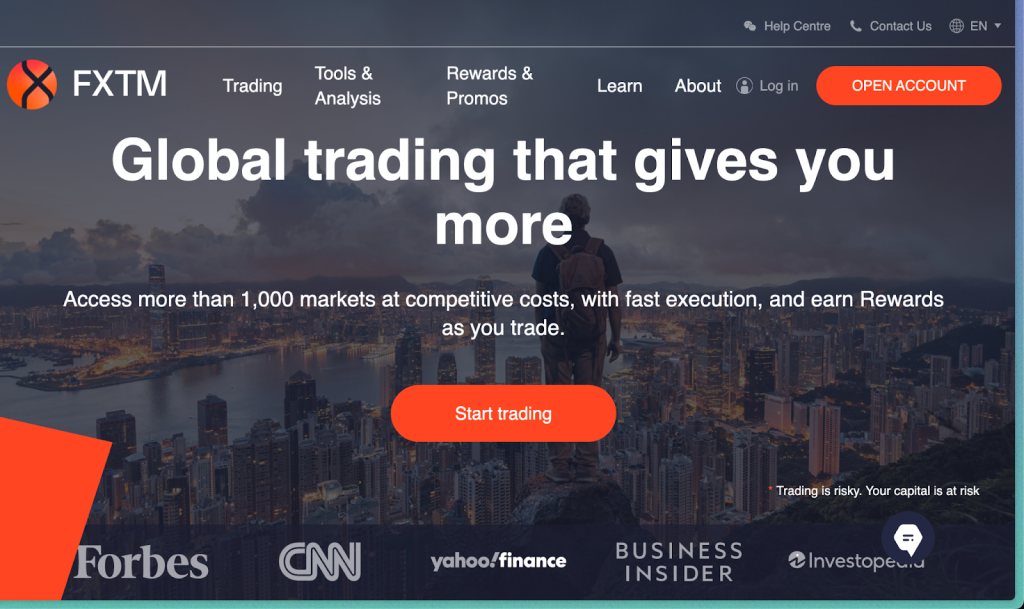 Alt text: FXTM homepage displaying European FCA-regulated broker with conservative approach, educational resources, ECN accounts and 5 major crypto CFDs on MT4/MT5 platforms